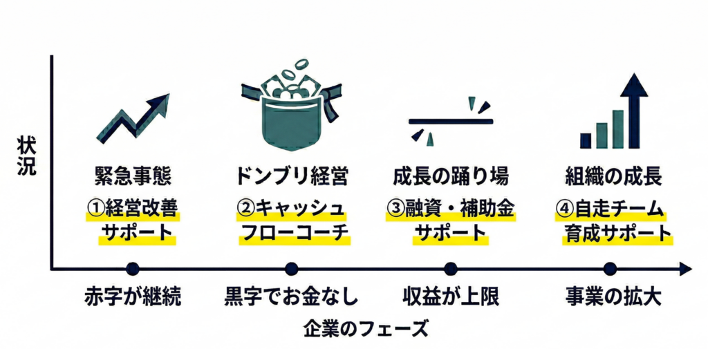 「赤字が継続」、「黒字でお金なし」、「収益が上限」、「事業の拡大」といった企業のフェーズに合わせ、経営改善から資金調達、組織の自走まで、私たちはあなたの「いま」に最適な伴走支援を行います。